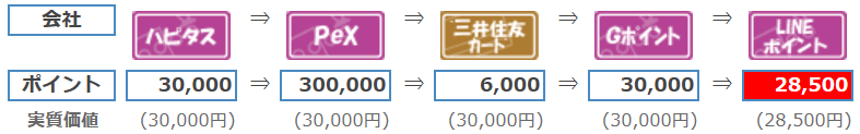 ハピタスからLINEポイントへは直接交換できないので、ポイ探で調べてみると、上の図のようなルートが出てきました。